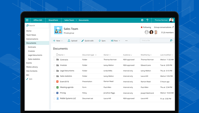 SharePoint-DMS vereinfacht die Zusammenarbeit, weil jedes Dokument von beliebigen Standorten und Geräten (PC, Tablet, Handy) aus bearbeitet und freigegeben werden kann. DMS spiegelt Informationen über den Zeitpunkt und den Initiator einer Änderung wider. Es besteht also keine Gefahr der Replikation eines Dokuments. Mit dem OneDrive-Speicher ist es überhaupt kein Problem, sogar offline auf Dokumente zuzugreifen.