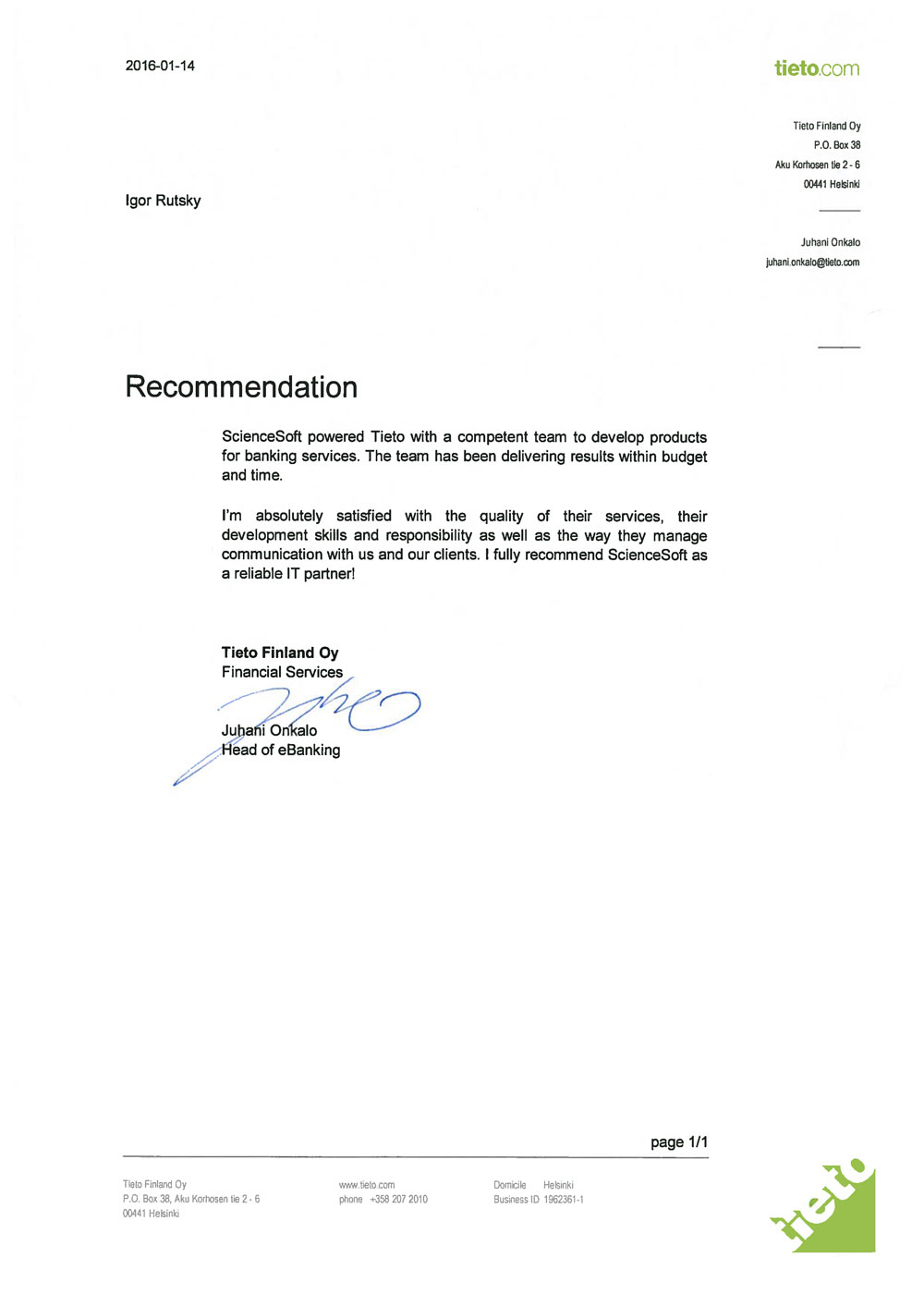 ScienceSoft unterstützte Tieto mit seinem kompetenten Team, um Produkte für Bankdienstleistungen zu entwickeln. Ich kann ScienceSoft uneingeschränkt als zuverlässigen IT-Partner empfehlen!