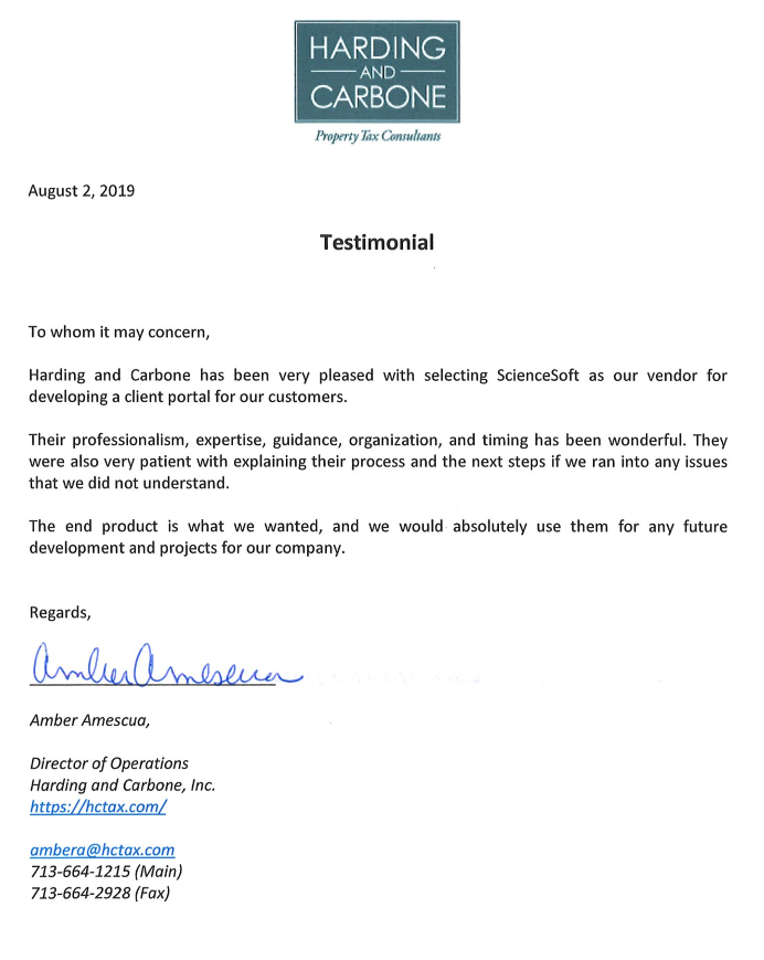 Harding and Carbone hat sich sehr darüber gefreut, dass wir ScienceSoft als Dienstleister für die Entwicklung eines Kundenportals für unsere Klienten ausgewählt haben.